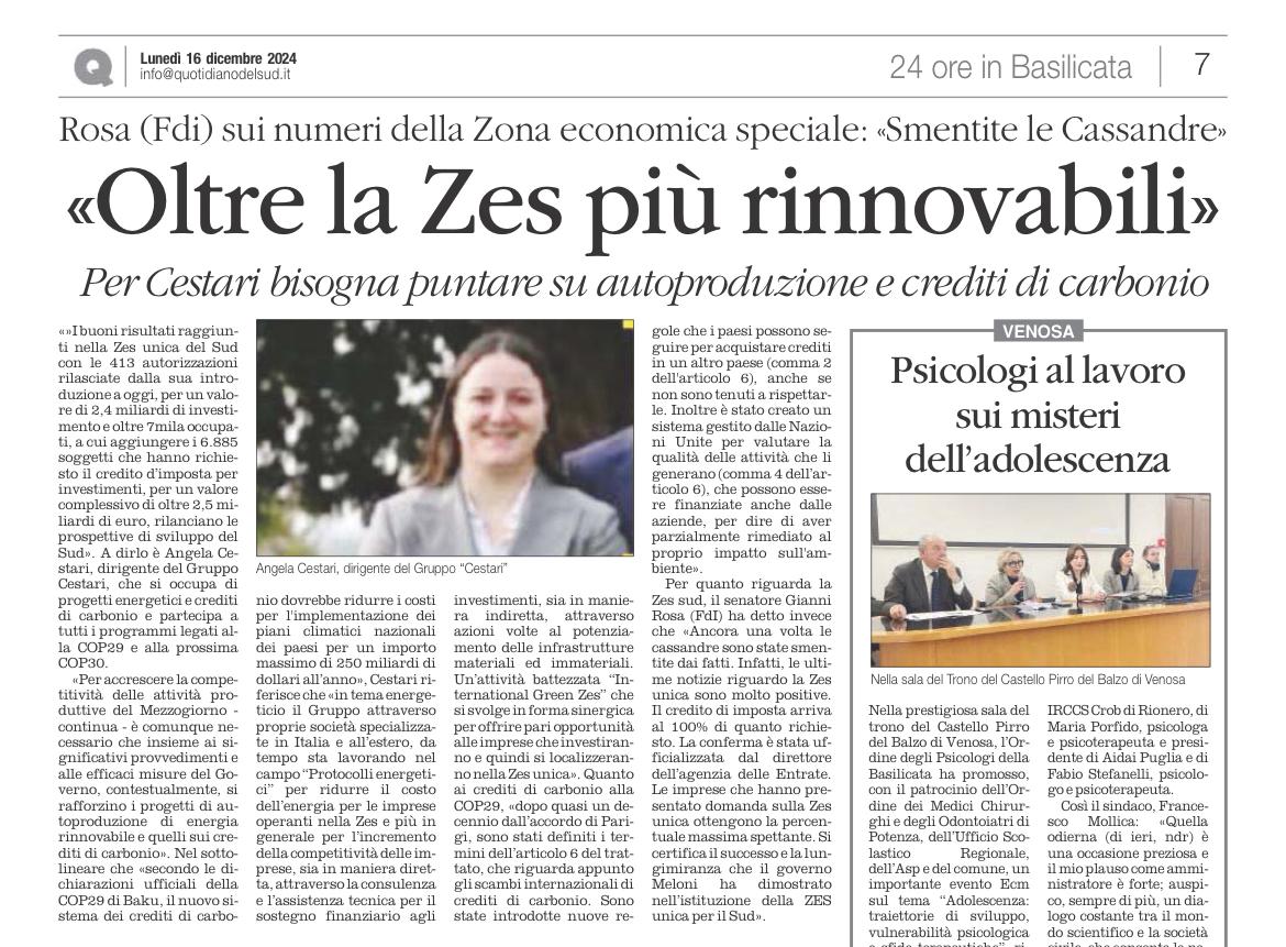 Così Angela Cestari, dirigente del Gruppo Cestari, che si occupa nello specifico di progetti energetici e sui crediti di carbonio e partecipa a tutti i programmi legati alla COP29 e alla prossima COP30 . Nel sottolineare che “secondo le dichiarazioni ufficiali della COP29 di Baku, il nuovo sistema dei crediti di carbonio dovrebbe ridurre i costi per l’implementazione dei piani climatici nazionali dei paesi per un importo massimo di 250 miliardi di dollari all’anno” Angela Cestari riferisce che “in tema energetico il Gruppo attraverso proprie società specializzate in Italia e all’estero, da tempo sta lavorando nel campo “Protocolli energetici” per ridurre il costo dell’energia per le imprese operanti nella ZES e più in generale per l’ incremento della competitività delle imprese, sia in maniera diretta, attraverso la consulenza e l’assistenza tecnica per il sostegno finanziario agli investimenti, sia in maniera indiretta, attraverso azioni volte al potenziamento delle infrastrutture materiali ed immateriali.